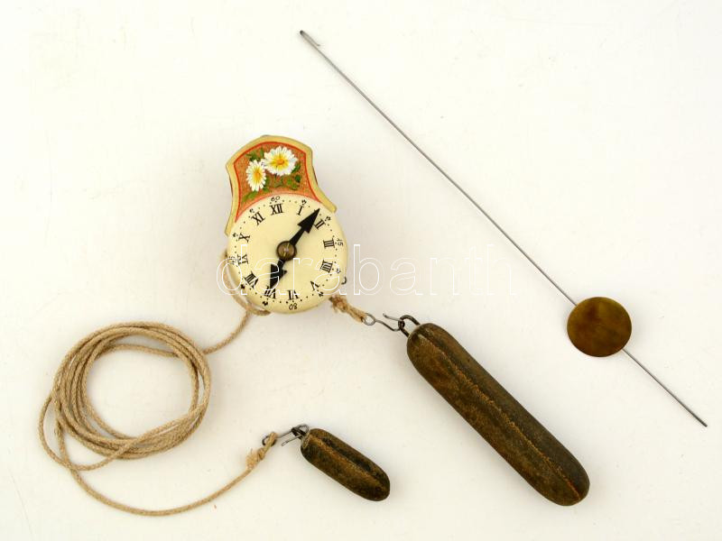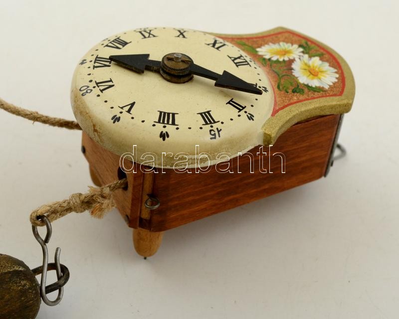 Különleges, fából készült óra, részben fa és zsineg szerkezettel, kézzel festett fa számlappal. Működik. Ritkaság! /