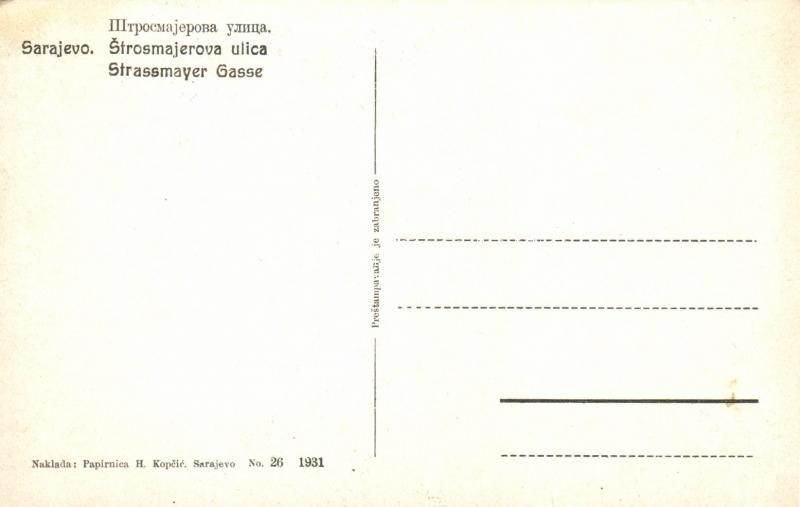 Sarajevo, Strosmajerova ulica / Strassmayer Gasse / street view, shop ... https://www.darabanth.com/de/26-Gross-Auktion/26.1/Ansichtskarten/Bosnien-und-Herzegowina~10174/Sarajevo-Strosmajerova-ulica-Strassmayer-Gasse-street-view-shop-of-E-Milanovic~II1483548