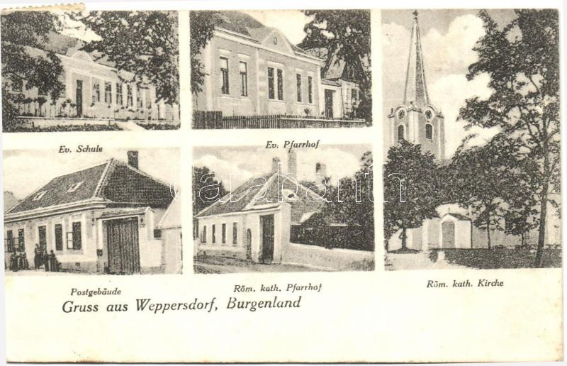 Beschreibung: Veperd, Weppersdorf; Evangélikus iskola és plébánia, Római katolikus plébánia és templom, posta / school, rectories, church, post, Verlag Josef Rainer (EK)