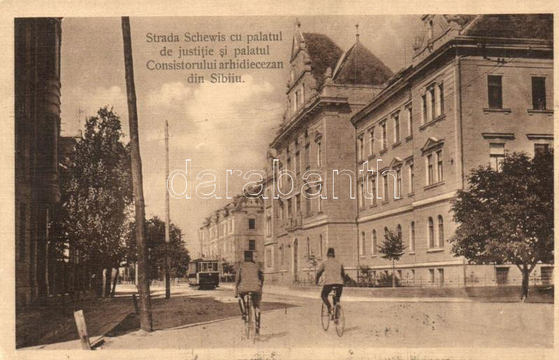 Beschreibung: Nagyszeben, Hermannstadt, Sibiu; Schewis utca, Igazságügyi palota, Főegyházmegyei palota, villamos kerékpárosokkal / street, palace of justice, archdiocesan palace, tram