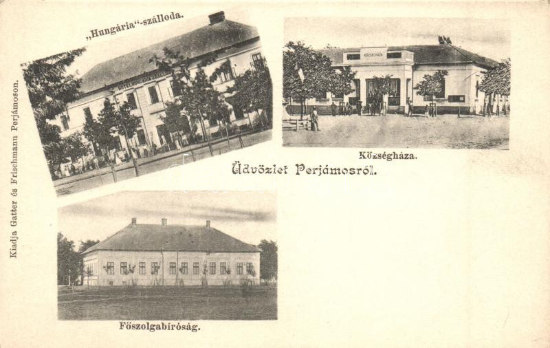 Beschreibung: Perjámos, Periam; Hungária szálloda, Községháza, Főszolgabíróság. Kiadja Gatter és Frischmann / hotel, town hall, court