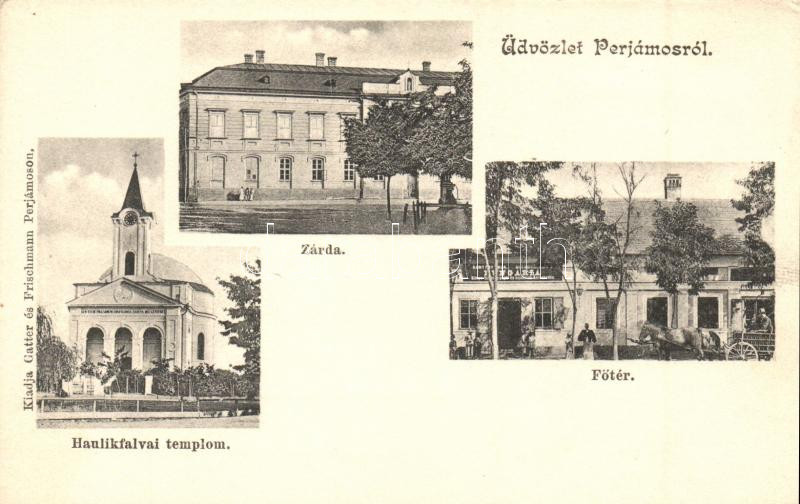 Beschreibung: Perjámos, Periam; Zárda, Haulikfalvi templom, Fő tér Hungária könyvnyomdával. kiadja Gatter és Frischmann / nunnery, church, main sqaure with printing shop