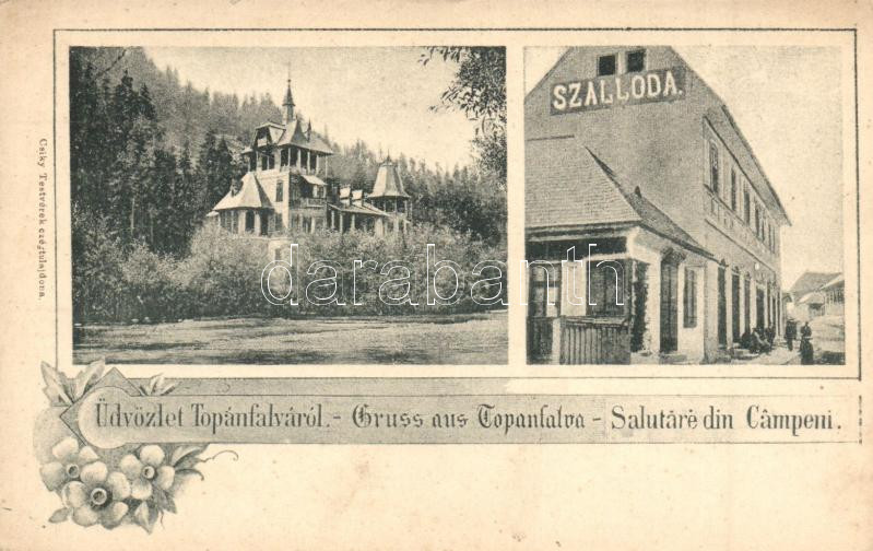 Beschreibung: Topánfalva, Campeni; Szálloda, Schlessel és Walter-féle kastély. Csíky Testvérek kiadása / hotel and villa, floral