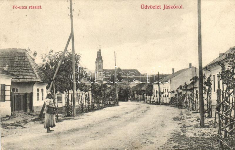 Beschreibung: Jászó, Jasov; Fő utca részlete templommal / main street with church (EK)