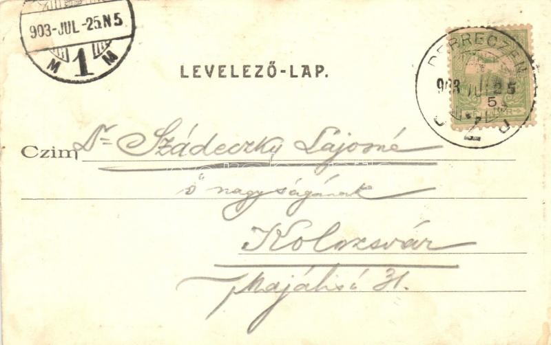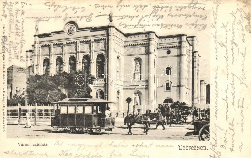 Beschreibung: Debrecen, Városi színház lóvasúttal, omnibusz, Haranghy Gy. amateur felvétele után kiadja Telegdy Lajos utóda (EK)