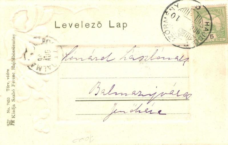 Beschreibung: Hajdúböszörmény, Kossuth tér, Református templom. Art Nouveau virágos litho képeslap. Kiadja Szabó Ferenc No. 7453.