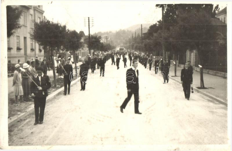 Beschreibung: Sopron, A Bányamérnöki és Erdőmérnöki főiskola valétáló akadémistáinak 'szalamander' menete, Studentika, photo