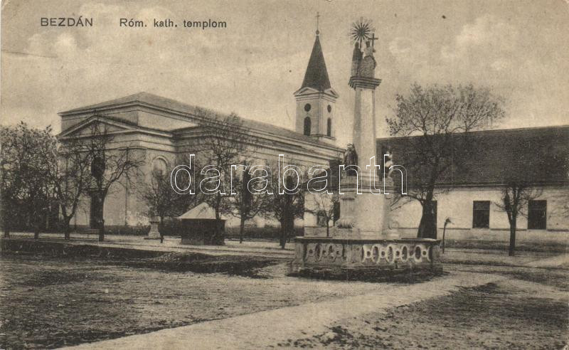 Bezdán, Római katolikus templom, Szentháromság szobor. Ligeti Győző ki... https://www.darabanth.com/de/26-Gross-Auktion/26.1/Ansichtskarten/Vojvodina~10164/Bezdan-Romai-katolikus-templom-Szentharomsag-szobor-Ligeti-Gyozo-kiadasa-church-with-sta~II1486551
