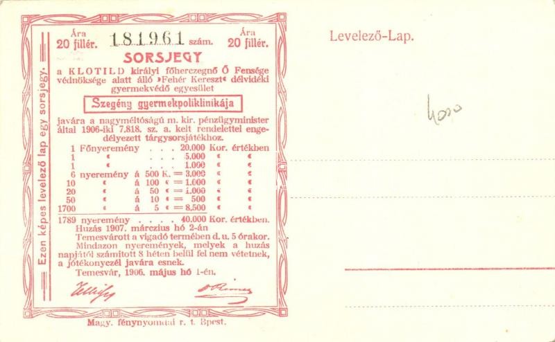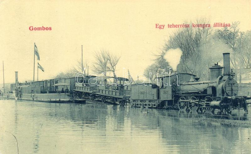 Beschreibung: Gombos, Bogojeva; egy teherrész kompra állítása. Hátoldalon sorsjegy a Szegény gyermekpoliklinika javára / ferry, freight train. Charity card on the backside