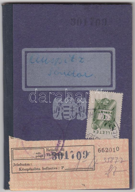Beschreibung: 1945 Munkakönyv a Budapesti Kávésok Ipartestülete bélyegzőjével, okmánybélyeggel (1 pengő, 1 ft.), pp.:63, 14x10cm