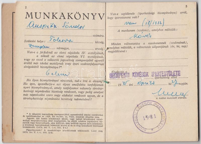 1945 Munkakönyv a Budapesti Kávésok Ipartestülete bélyegzőjével, okmán... https://www.darabanth.com/de/260-Fernauktion/260.0/Andere-Sammelgebiete/Dokument~15/1945-Munkakonyv-a-Budapesti-Kavesok-Ipartestulete-belyegzojevel-okmanybelyeggel-1-pengo-~II1287641