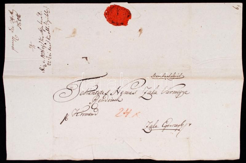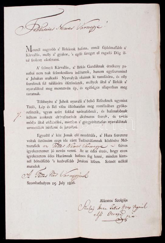 Beschreibung: 1806 Szalay Imre Vas vármegyei főorvos körlevele Zala vármegye rendjeinek a juhokat pusztító betegségekről, autográf aláírásával, pecsételt levélem.