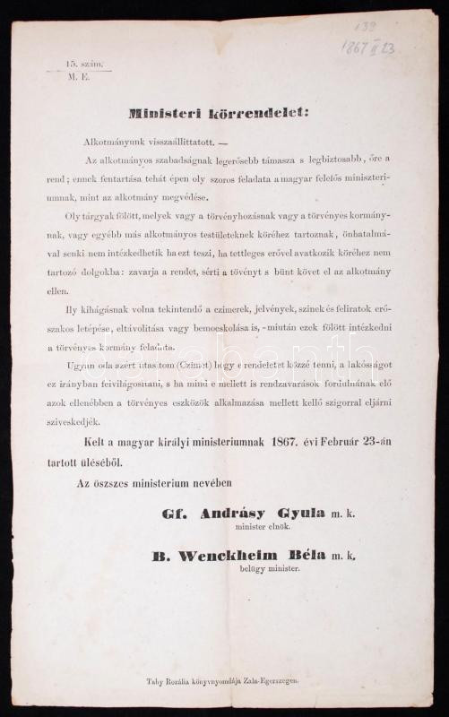 1867 gróf Andrássy Gyula miniszterelnök körrendelete nemzeti jelképek ... https://www.darabanth.com/de/260-Fernauktion/260.0/Andere-Sammelgebiete/Drucksachen~26/1867-grof-Andrassy-Gyula-miniszterelnok-korrendelete-nemzeti-jelkepek-iranti-vedelemrol-ill~II1283004