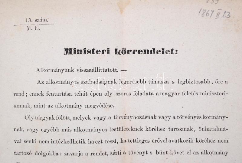 Beschreibung: 1867 gróf Andrássy Gyula miniszterelnök körrendelete nemzeti jelképek iránti védelemről, illetve azok megsértésének büntetéséről. 34x21 cm.