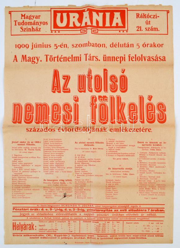 Beschreibung: 1909 Bp., Az Uránia Magyar Tudományos Színház "Az utolsó nemesi fölkelés százados évfordulójának emlékezetére" című műsorának plakátja, hajtott, 45x32 cm