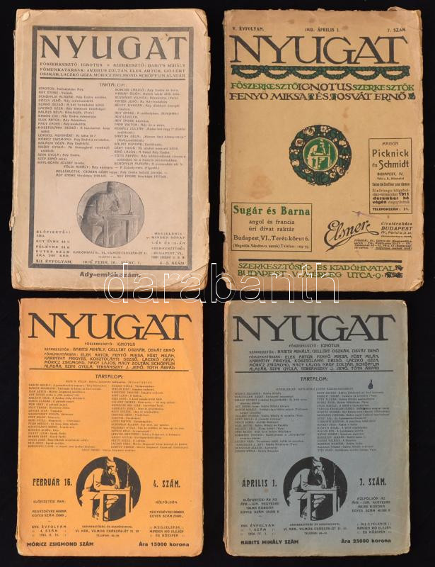 1912-1924 Nyugat. Főszerk.: Ignotus. 4 szám, kissé viseltes állapotban https://www.darabanth.com/de/260-Fernauktion/260.0/Andere-Sammelgebiete/Drucksachen~26/1912-1924-Nyugat-Foszerk-Ignotus-4-szam-kisse-viseltes-allapotban~II1280563