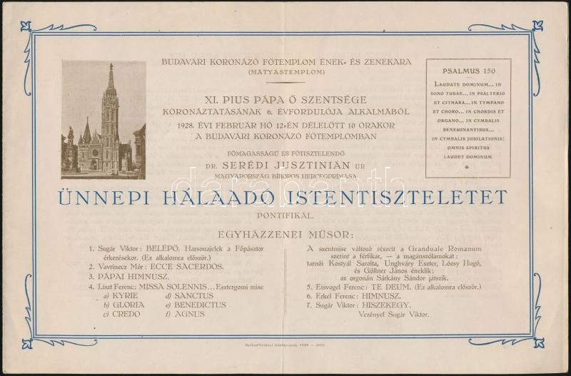 Beschreibung: 1915-28 dr. Breyer István: Ünnepi Szentbeszéd a Budavári koronázó Főtemplom kilencszáz éves fennállásának jubileumi ünnepségén, pp.:15, 23x16cm + Ünnepi hálaadó istentisztelet nyomtatványa, kihajthatós, 16x24cm