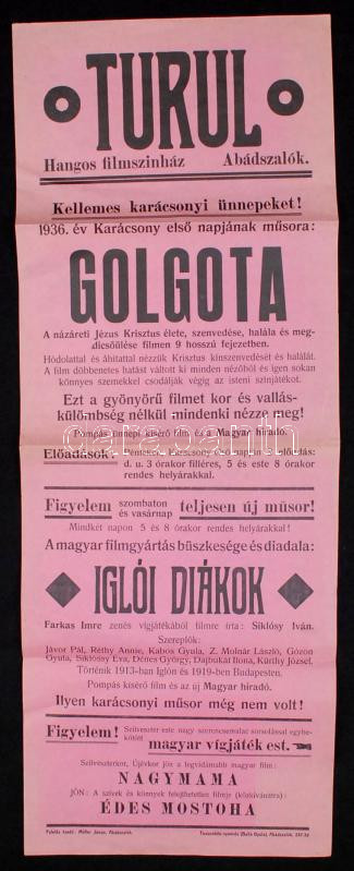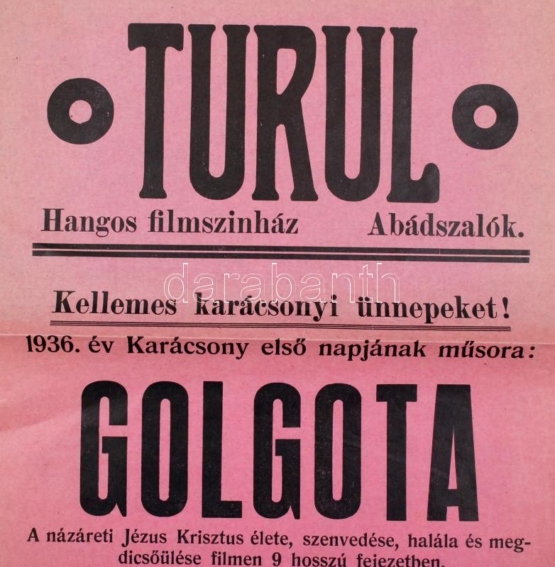 1936 A Golgota című film plakátja. Turul. Hangos filmszínház, Abádszal... https://www.darabanth.com/de/260-Fernauktion/260.0/Andere-Sammelgebiete/Drucksachen~26/1936-A-Golgota-cimu-film-plakatja-Turul-Hangos-filmszinhaz-Abadszalok-62x23cm~II1286632