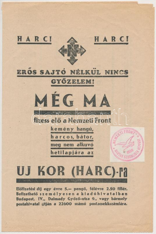 Beschreibung: 1936 Nemzeti Front, Magyar Szocialista Néppárt bélyegzővel Nemzet Szocialista sajtó vásárlásra buzdító nyomtatvány, 32x23cm