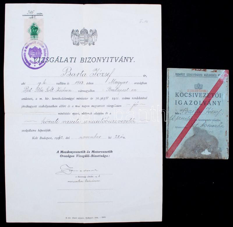 Beschreibung: 1942 Sínautóbusz kocsivezetői igazolvány, valamint vizsgálati igazolvány közúti vasúti sínautóbuszvezetői képesítésről.