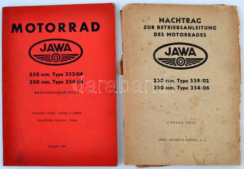 1961-62 Két db német nyelvű Jawa motorkerékpár használati utasítása, v... https://www.darabanth.com/de/260-Fernauktion/260.0/Andere-Sammelgebiete/Drucksachen~26/1961-62-Ket-db-nemet-nyelvu-Jawa-motorkerekpar-hasznalati-utasitasa-valamint-egy-magyar-nye~II1280178