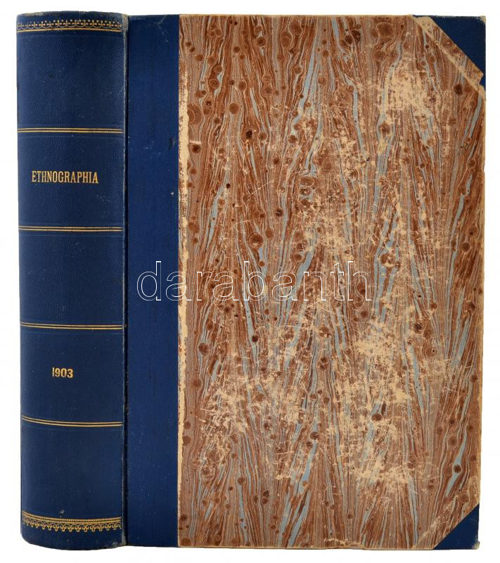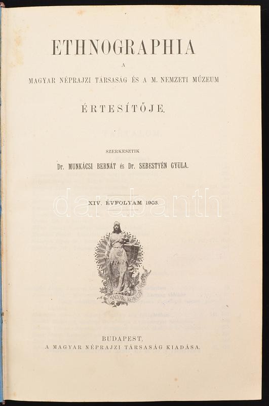Ethnographia. A Magyar Néprajzi Társaság értesítője. 1903. XIV. évfolyam. 1-10. szám. Teljes évfolyam! Szerk. Dr. Munkácsi Bernát, Dr. Sebestyén Gyula. Bp. 1903, Magyar Néprajzi Társaság. 380 p, Korabeli, dekoratív félvászonkötésben. A címlapról a könyvtári pecsétet levakarták.