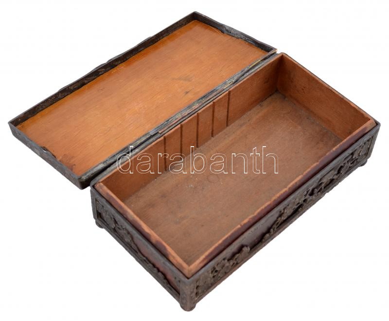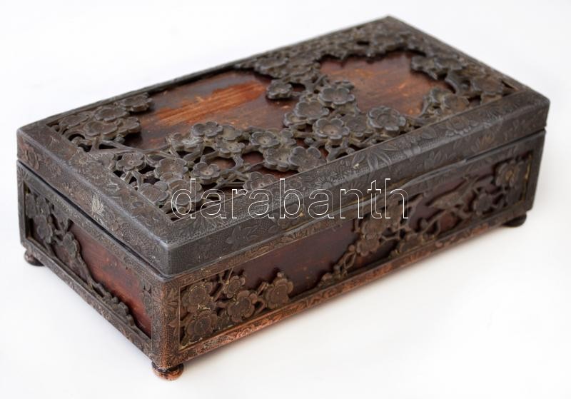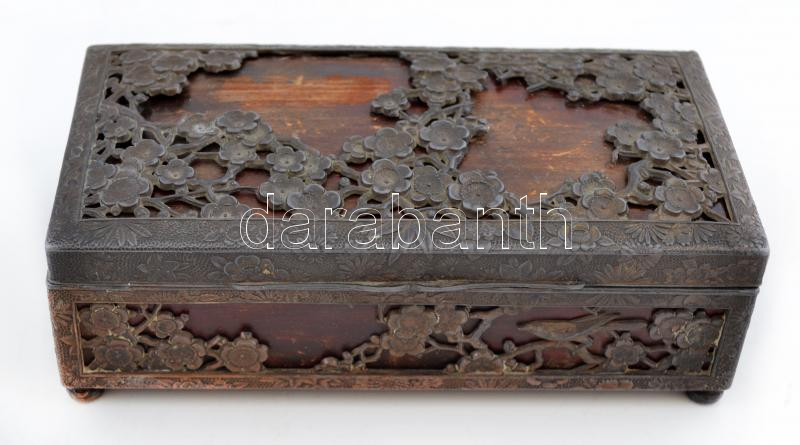 Beschreibung: Ónkeretes, virágmotívumokkal díszített fa doboz, a teteje lejár, 18x9x5,5 cm