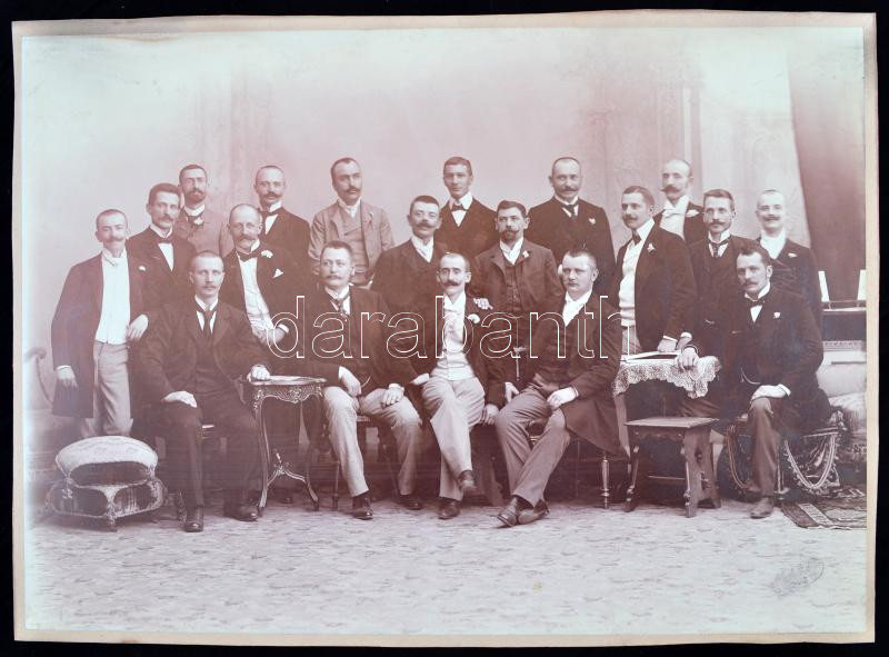 Beschreibung: 1901. augusztus 15. Medek Rezső műtermi csoportképe, 27x38 cm, karton 28x39 cm