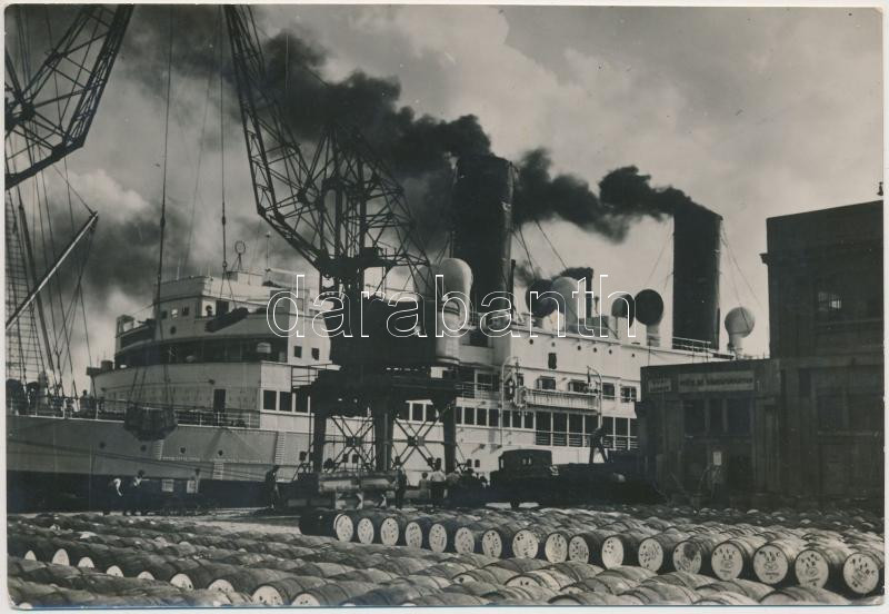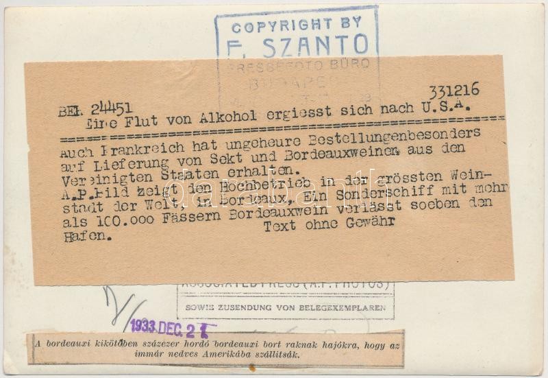 1933 A bordeauxi kikötőben százezer hordó bordeauxi bort raknak hajókra, hogy az immár nedves Amerikába szállítsák, The Associated Press, jelzett sajtó fotó felirattal, 11x17cm