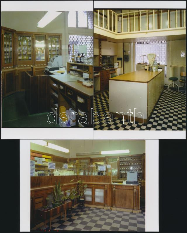 1981 Budapest, VIII. ker., Bacsó Béla u. 32. sz. alatti gyógyszertár belső fotói, 3 db korabeli professzionális felvételről készült modern nagyítás, adatolva a negatívokat nyilvántartó füzetben volt, 10x15 cm