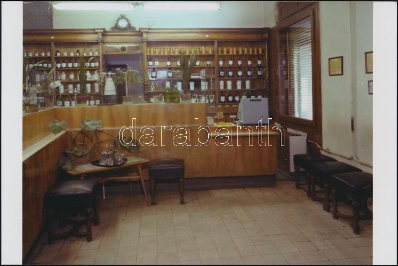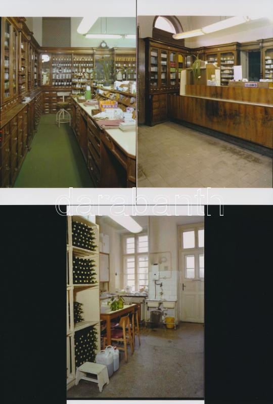 1981 Budapest, VIII. ker., Horváth Mihály utcai gyógyszertár belső fotói, 4 db korabeli professzionális felvételről készült modern nagyítás, adatolva a negatívokat nyilvántartó füzetben volt, 10x15 cm
