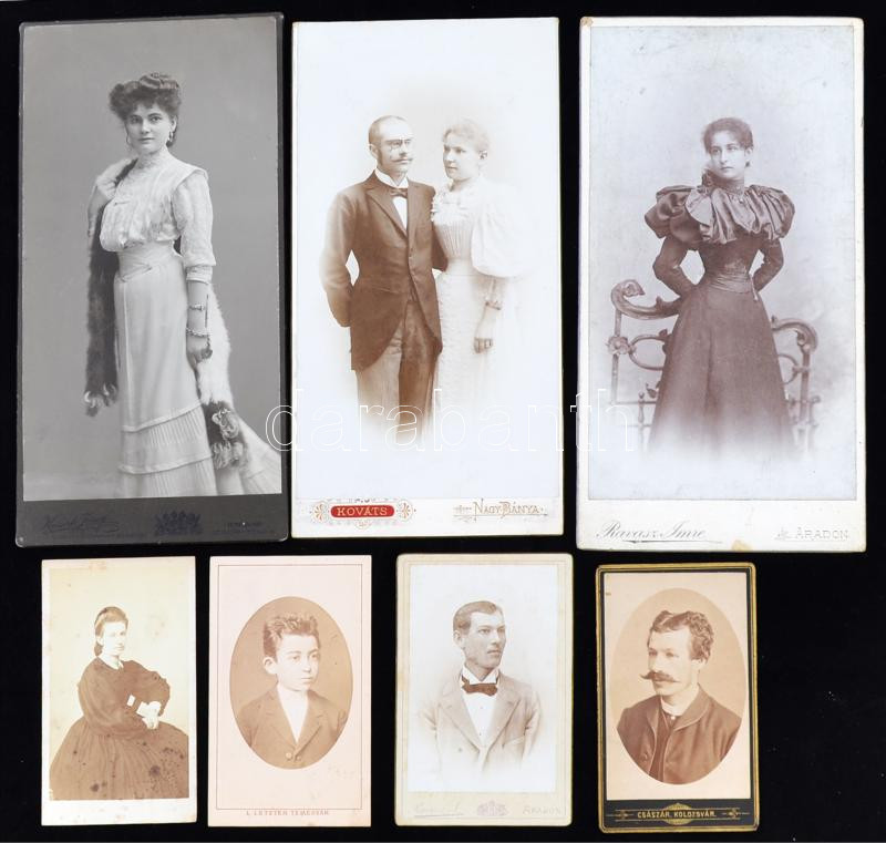 cca 1900 Erdélyi fotótörténeti tétel, 7 db fotó Arad, Temesvár, Nagyvárad, Kolozsvár, Nagybánya műtermeiből, 10,5x6,5 cm és 20,5x11 cm között