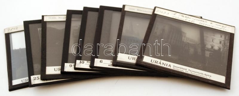Beschreibung: cca 1920 Erdély, az Uránia Szemléltető és Taneszközök Gyára által készített és kiadott 8 db vetíthető üveglemez diapozitív képek, feliratozva, 8x8 cm