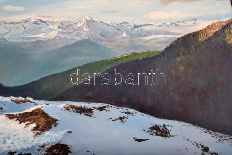 Beschreibung: Krizsán jelzéssel: Hegycsúcsok. Olaj, vászon, keretben, 50×62 cm