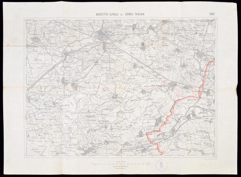 cca 1911 Berettyó-Ujfalu és Körös-Tarján katonai térképe. 1:75000. Részben helyesbitve 1911. V. 22-ig. A M. Kir. 11. honvéd gyalogezred. parancsnoksági pecsétjével. 62x48 cm.