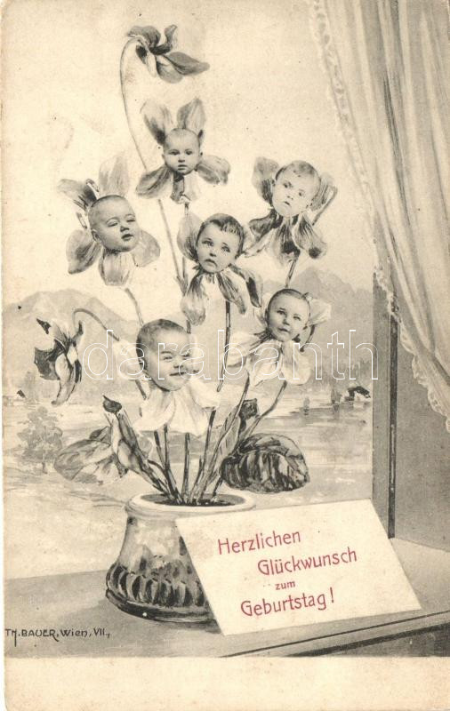 Birthday, Flower with baby heads, bizarre, B.K.W.I. 905/4. s: Th. Baue... https://www.darabanth.com/de/260-Fernauktion/260.0/Ansichtskarten/GruC39Fkarten-Feste~100077/Birthday-Flower-with-baby-heads-bizarre-BKWI-9054-s-Th-Bauer~II1243508