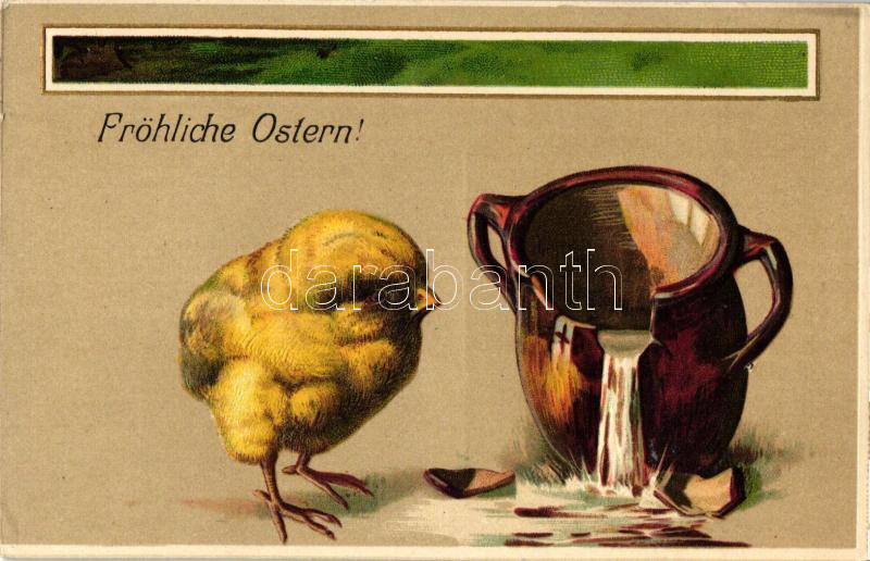 'Fröhliche Ostern!' / Easter, chicken with broken pot, litho... https://www.darabanth.com/de/260-Fernauktion/260.0/Ansichtskarten/GruC39Fkarten-Feste~100077/Frohliche-Ostern-Easter-chicken-with-broken-pot-litho-Emb-EK~II1241311