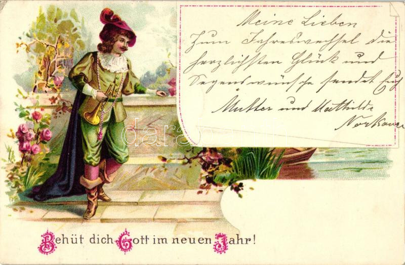 Beschreibung: New Year, man with trumpet, floral litho (EK)