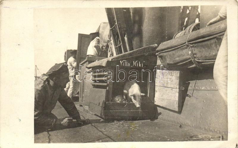 Beschreibung: 1915 WWI Austro-Hungarian battle ship, mariner on board with pig, 'Villa Niki', photo