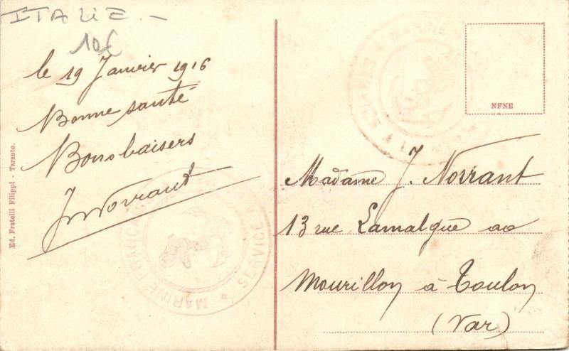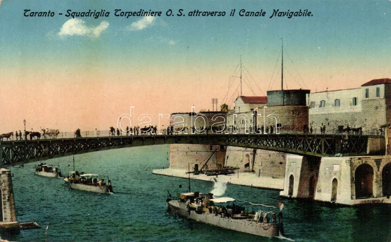 Taranto, Squadriglia Torpediniere O. S. attraverso il Canale Navigable / Italian Marine, torpedo boats crossing the canal 'Marine Francais, Service a la Mer' cancellation (b)