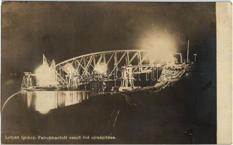 Felrobbantott vasúti híd újraépítése, Hadifénykép kiállítás, a felvételt készítette Lutyen Ignác / Reconstruction of a blown up bridge, Hungarian Military Photo Exhibition, picture taken by Ignác Lutyen (b)