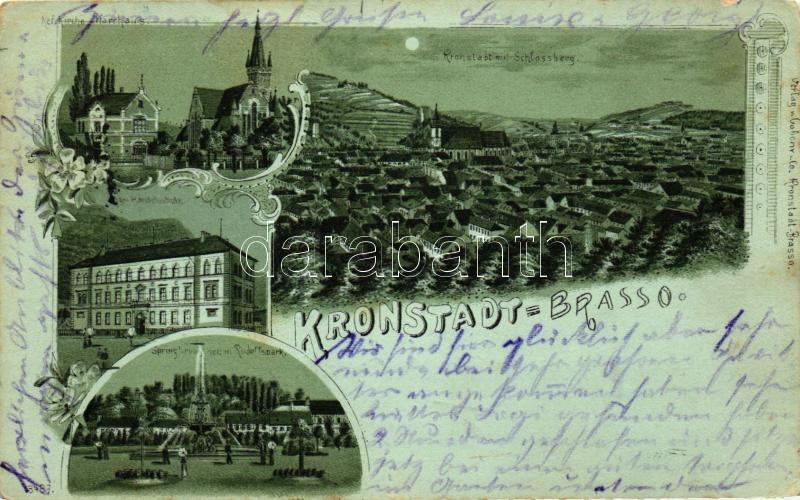1899 Brassó, Kronstadt, Brasov; Springbrunnen, Rudolfspark, Schlossberg, Ref. Kirche Pfarrhaus, Handelsschule / fountain, park, castle hill, church , school, Art Nouveau litho (EK)
