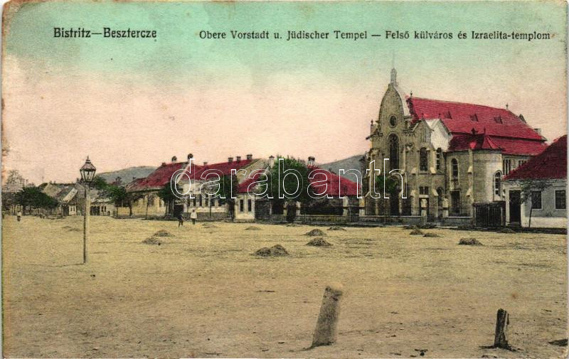 Beszterce, Bistrita; Felső külváros és Izraelita templom, zsinagóga / ... https://www.darabanth.com/de/260-Fernauktion/260.0/Ansichtskarten/Siebenburgen~100020/Beszterce-Bistrita-Felso-kulvaros-es-Izraelita-templom-zsinagoga-upper-city-synagouge-ki~II1284863