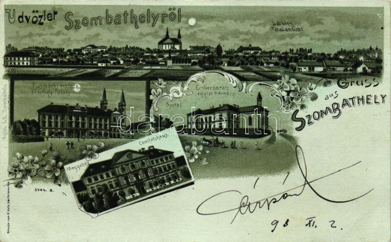 Beschreibung: 1898 Szombathely, Emberbaráti egylet kórháza, Megyeháza, Püspöki palota, floral, litho (vágott / cut)