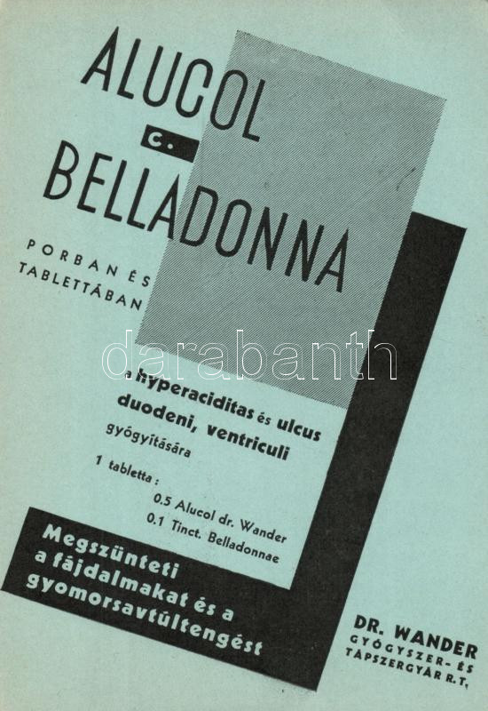 Alucol c. Belladonna, megszűnteti a fájdalmakat és a gyomorsavtúltengé... https://www.darabanth.com/de/260-Fernauktion/260.0/Ansichtskarten/Werbungen~100101/Alucol-c-Belladonna-megszunteti-a-fajdalmakat-es-a-gyomorsavtultengest-Dr-Wander-gyogyszer~II1257557