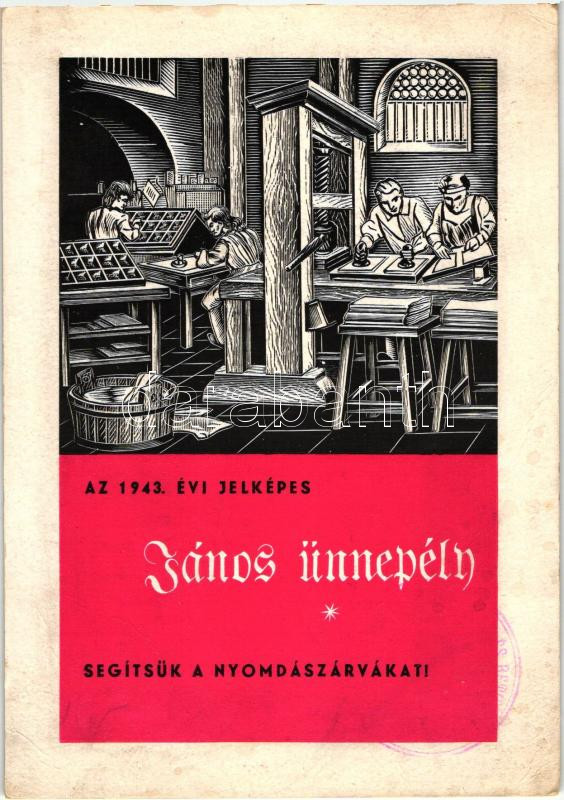 Az 1943. évi János ünnepély reklámlapja, 'Segítsük a nyomdászárvákat!' / advertisment postcard of the Hungarian typographers 'Johannes Gutenberg day' 1943. 'Help out the typographer orphans!' (fa)