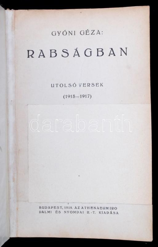 Gyóni Géza: Rabságban. Utolsó versek (1915-1917). Előszó: Tscheik Ernő... https://www.darabanth.com/de/260-Fernauktion/260.0/Bucher/Bucher-Sonstige-Raritaten~40/Gyoni-Geza-Rabsagban-Utolso-versek-1915-1917-Eloszo-Tscheik-Erno-Elso-kiadas-Bp-1~II1281063