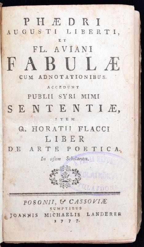 Phaedri Augusti Liberti et Fl. Aviani Fabulae cum Adnotationibus. Accendunt Publii Syri mimi, sententiae, item Q. Horatii Flacci : liber de arte poetica : in usum Scholarum. Possonii and Cassoviae (Pozsony és Kassa), 1777, Sumptibus Joannis Michaelis Landerer. 354 p + [4]