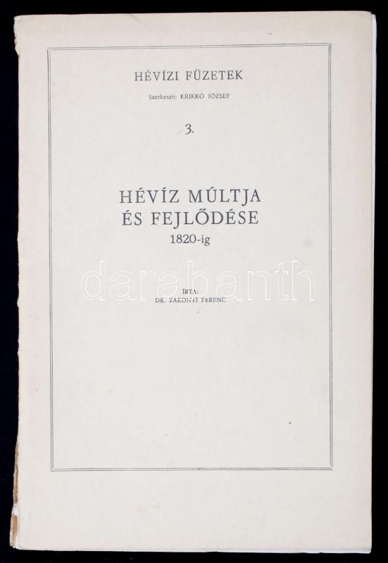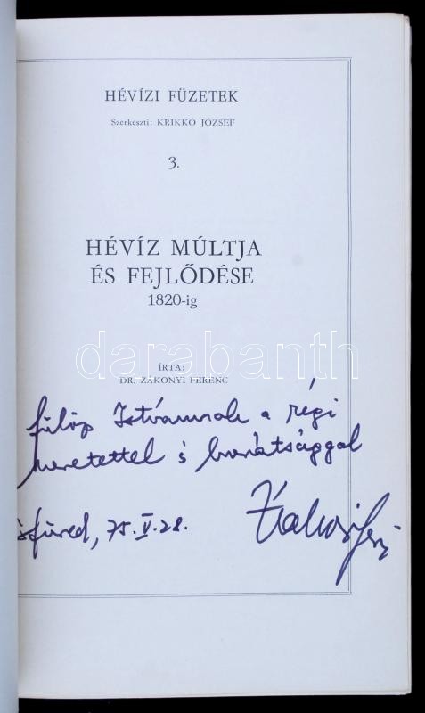 Zákonyi Ferenc Hévíz múltja és fejlődése 1820-ig. Szerk. Krikkó József. Hévíz, 1974., Petőfi ny. 79 p. Kiadói, a gerincén enyhén sérült papírkötésben. Dedikált példány!