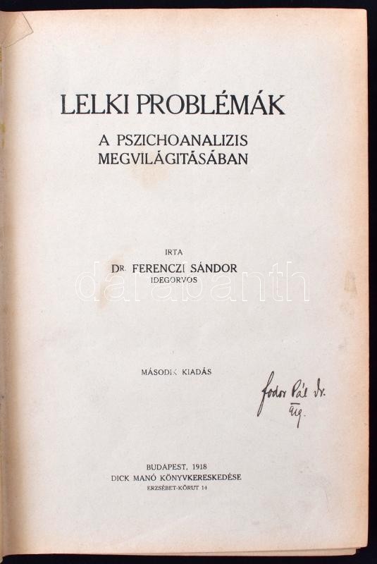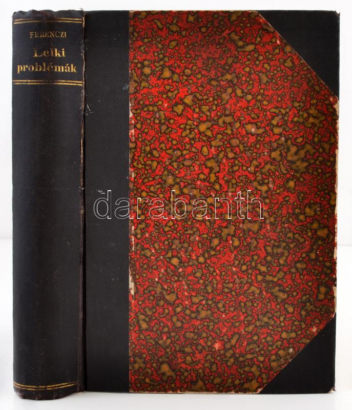 Colligatum kötet. Ferenczi Sándor: Lelki problémák a pszichoanalízis megvilágításában. Bp., 1918, Dick Manó. 150 p. Ferenczi Sándor: Lélekelemzés. S. Freud előszavával. Bp., é.n., Dick Manó. 93 p. Sigmund Freud: Három értekezés a szexualitás elméletéről. Fordította Ferenczi Sándor. Bp., 1915, Dick Manó. 91 p. S. von. Ferenczi: Hysyterie und Pathoneurosen. Wien, 1919, Internationalischer Psychoanalytischer Verlag. 79 p. Sigmund Freud: Über Psychoanalyse. Wien, 1919, Franz Deuticke. 62 p. Korabeli aranyozott félvászonkötésben, a gerinc hosszanti irányban felszakadt, sérült.